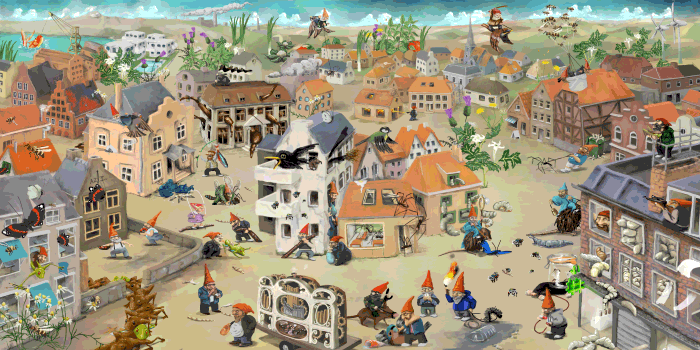 A small town by the sea. While fields reach out into the scenic horizon, brutal events are unfolding in the town center, on the market place, and inside the buildings. A horde of gnomes has invaded the place, maltreating the animal inhabitants of the town in a cruel manner. Plants that have grown as big as houses create a rather dystopian and dark ambience, contrasting the bright and vivid images.